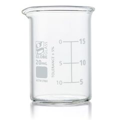 Beaker, Globe Glass, 20mL, Low Form Griffin Style, Dual Graduations, ASTM E960, 12/Box- Item #8010020Please log in to view specific pricing.