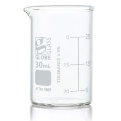 Beaker, Globe Glass, 30mL, Low Form Griffin Style, Dual Graduations, ASTME960, 12/Box- Item #8010030Please log in to view specific pricing.