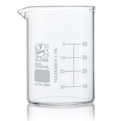 Beaker, Globe Glass, 50mL, Low Form Griffin Style, Dual Graduations, ASTM E960, 12/Box-Item #8010050Please log in to view specific pricing.