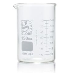 Beaker, Globe Glass, 150mL, Low Form Griffin Style, Dual Graduations, ASTM E960, 12/Box-8010150Please log in to view specific pricing.