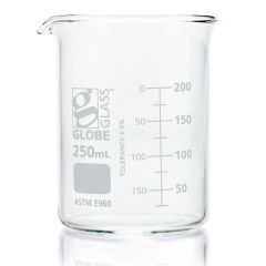 Beaker, Globe Glass, 250mL, Low Form Griffin Style, Dual Graduations, ASTM E960, 12/Box-Item #8010250Please log in to view specific pricing.